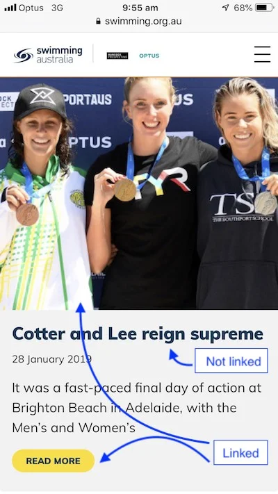 Swimming Australia new listing links the feature image and “read more” to the article but not the title which is what users are most likely to click.